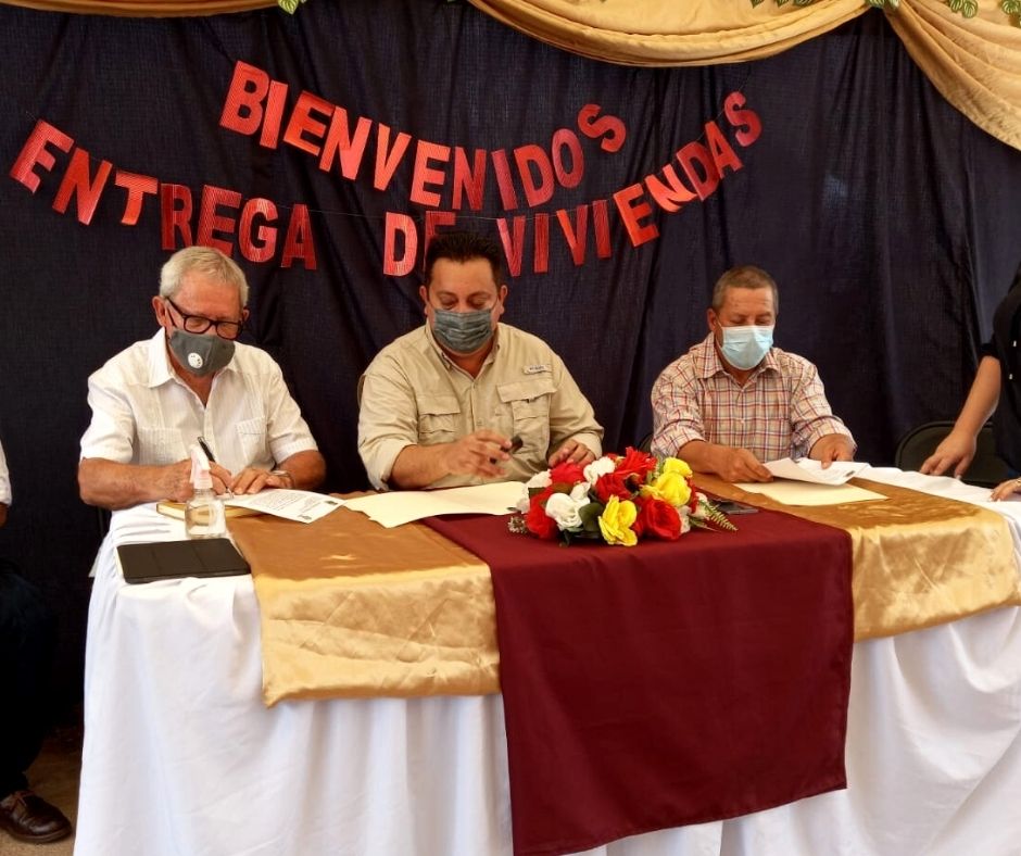 El alcalde de la municipalidad de La Arada y el director ejecutivo de PAG durante un evento de inauguración de viviendas donde las familias beneficiarias firmaron y recibieron el título de sus casas.