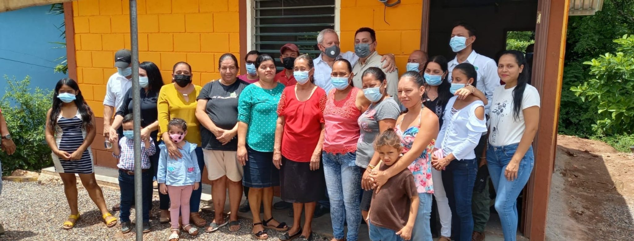 Las familias beneficiarias en frente de sus nuevas viviendas en el municipio de San José de Colinas, departamento de Santa Bárbara.