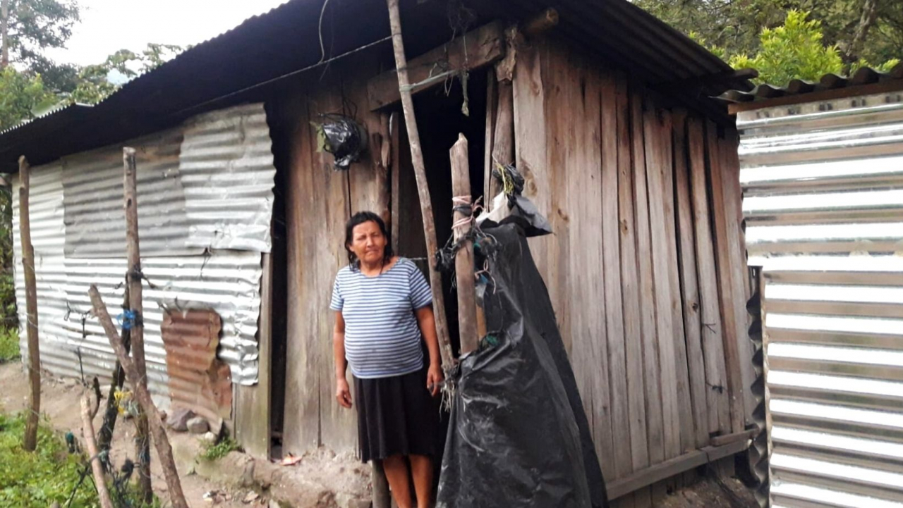 Beneficiaria Gertrudis Montoya de la comunidad de Jardines, departamento de Comayagua. Antes y después de mejoramiento de vivienda que incluye el reemplazo de paredes de lámina oxidada con columnas de madera y un forro de plástico que puede durar alrededor de 20 años.