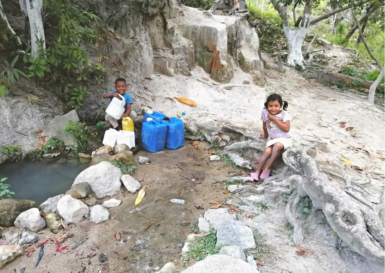 Familias de la comunidad de Ojo de Agua recolectan agua de un pequeño nacimiento de agua.