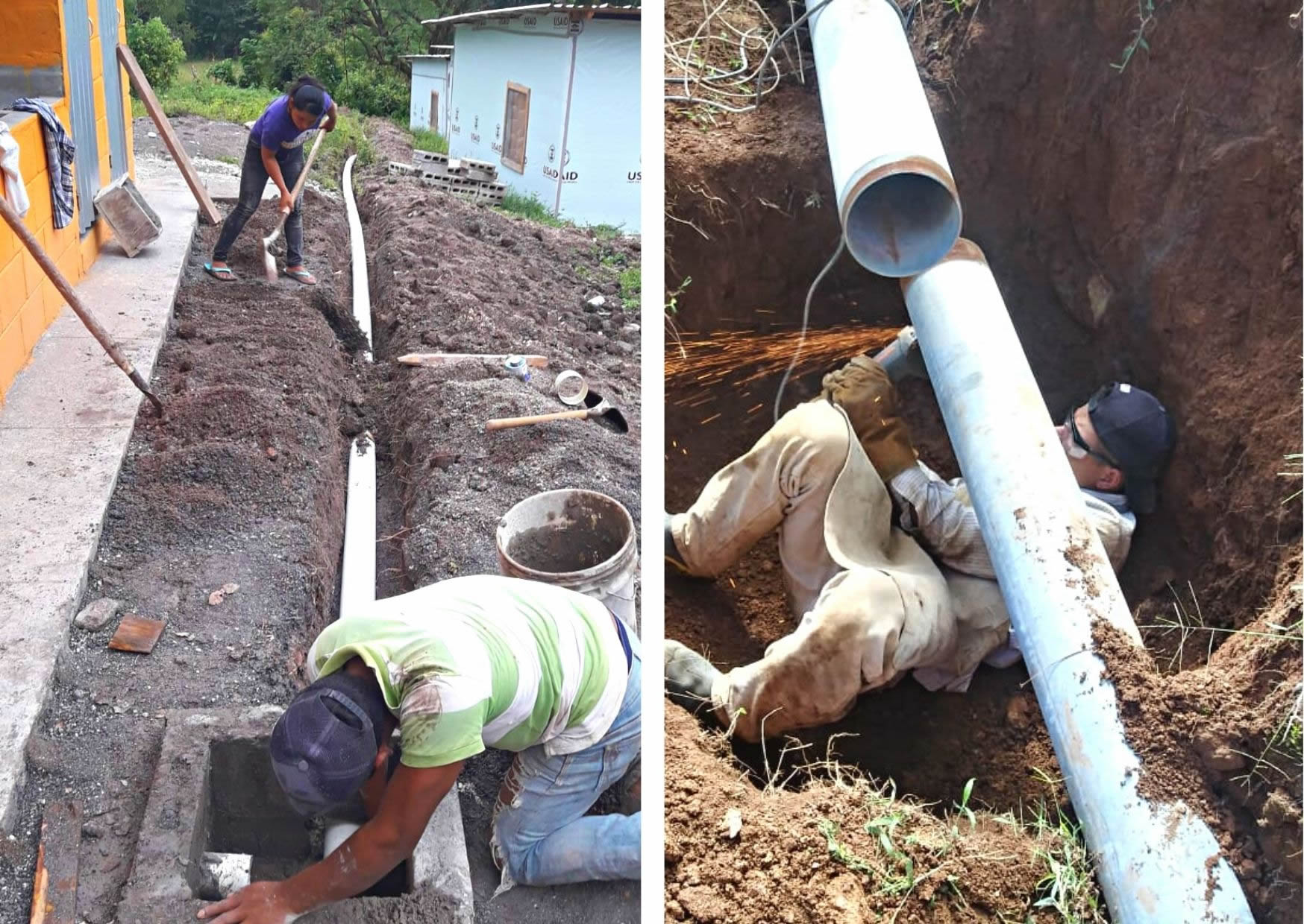 Foto izquierda: Instalación de tubería en la comunidad de El Aguacatal donde PAG también reparó casas y construyó servicios de saneamiento básico para aproximadamente 100 familias de origen Lenca.
